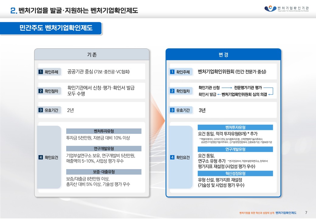 벤처기업확인제도는 공공기관 중심에서 벤처기업확인위원회인 민간 전문가 중심으로 변경이 되었습니다. 유효기간은 기존 2년에서 3년으로 변경이 되었습니다.