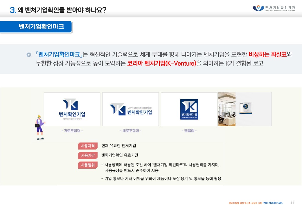 벤처기업확인마크는 혁신적인 기술력으로 세계 무대를 향해 나아가는 벤처기업을 표현한 비상하는 화살표와 무한한 성장 가능서응로 높이 도약하는 코리아 벤처기업을 의미하는 K가 결합된 로고로 되어 있습니다.