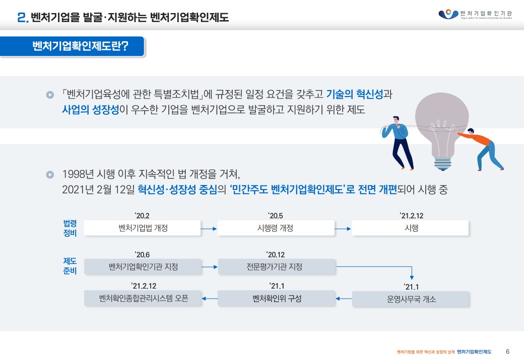 벤처기업 확인 제도란 벤처기업육성에 관한 특별조치법에 규정된 일정 요건을 갖추고 기술의 혁신성과 사업의 성장성이 우수한 기업을 벤처기업으로 발굴하고 지원하기 위한 제고입니다.1998년 시행 이후 지속적인 법 개정을 거쳐, 2021년 2월12일 혁신성, 성장성 중심의 민간주도 벤처기업확인제도로 전면 개편되어 시행중입니다.