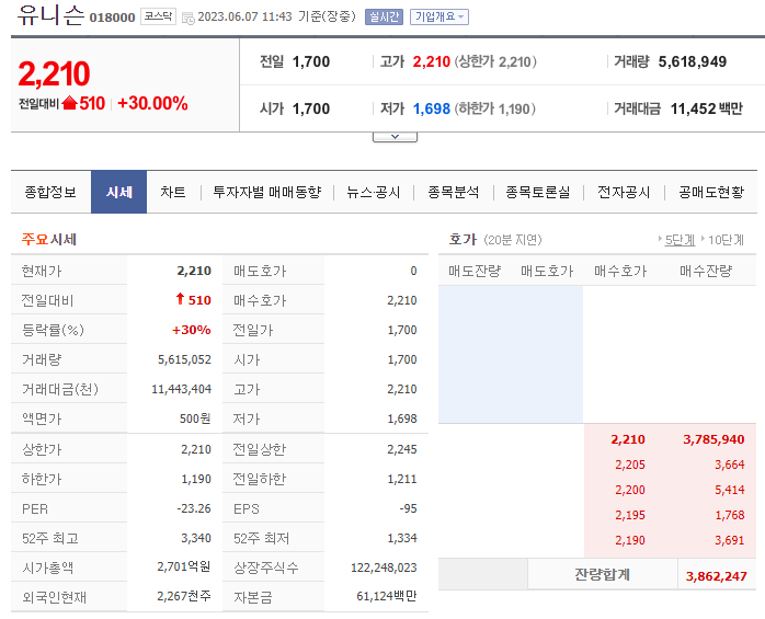 유니스 기업이 투자를 유치했다는 소식에 상한가를 기록하였습니다. 전일 거래 가격 대비 510원 오른 2210원에 거래되고 있습니다. 오늘은 유니슨 기업 개요, 재무제표, 주가 흐름에 대해서 포스팅해 보겠습니다.