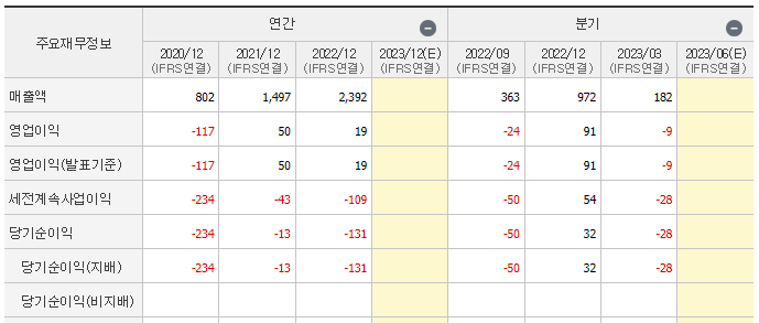 2023년 1분기 매출액은 181억원, 영업이익은 -9억 원, 당기순이익은 -28억 원을 신고하였습니다.